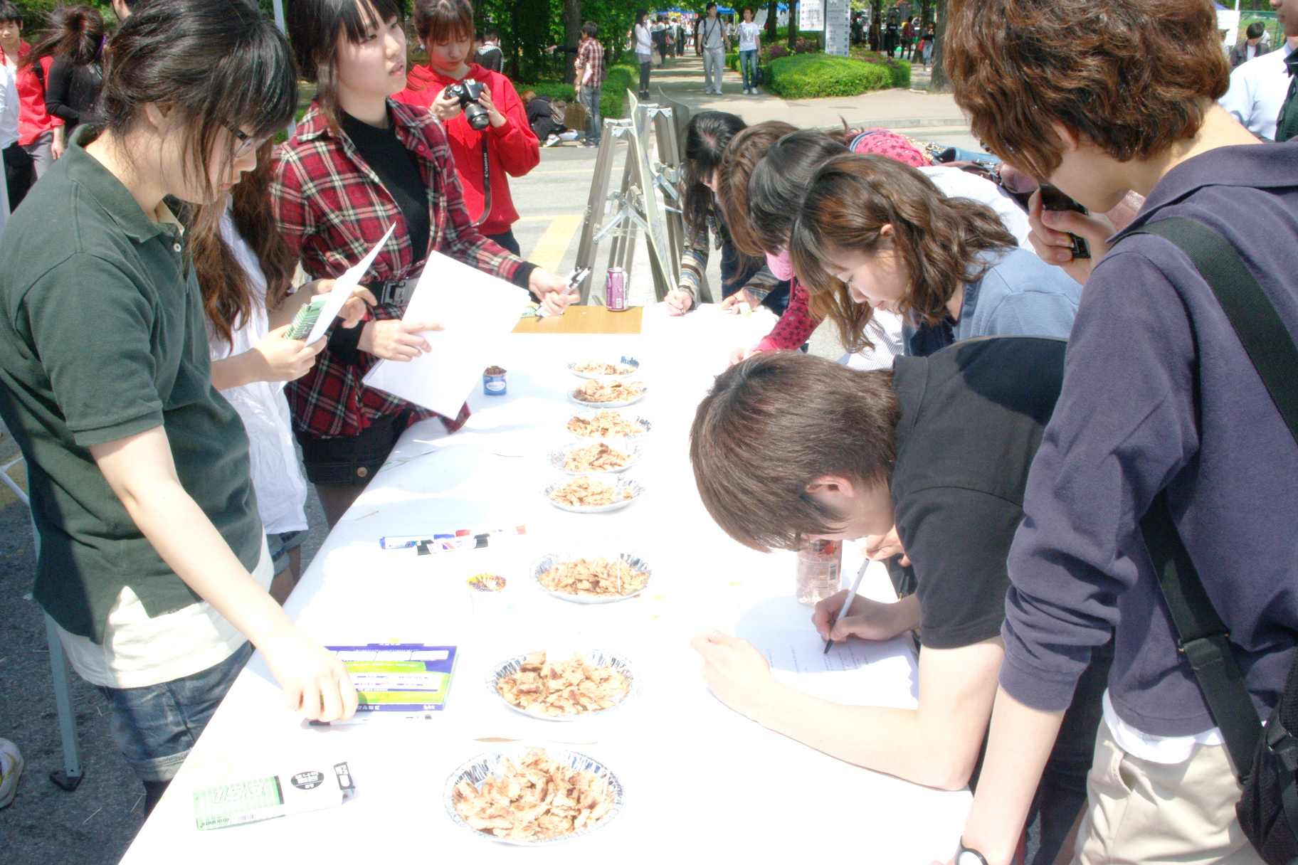 -건국대학교 행사시 소비촉진 시식회 및 설문 조사 실시해 ... - 1. 행 사 명: 건국대학교 오리고기 소비촉진 시식회 2. 행사일시: 2010. 5. 12(수). 12:00~15:00 3. 행사장소: 건국대학교 박물관 앞 삼각지 4. 주 최: (사)한국오리협회, 건국대학교 동물생산환경학과 □ 한국오리협회는 5월 12일(수) 건국대학교에서 오리고기 소비의 취약 계층인 대학생들을 대상으로 오리고기 소비촉진 시식회를 가졌다. □ 건국대학교 춘계 축제인 대동제를 맞이하여 동물생명과학대학 동물생산환경학과 학생들과 함께 진행한 이번 행사에서는 학생들에게 익숙한 오리고기 훈제 제품뿐만 아니라 오리 소시지, 오리 떡갈비 제품 등을 선보이며 좋은 반응을 얻었다. 이와 함께 오리고기 생산·유통 과정, 오리고기 효능에 관한 판넬을 설치하여 젊은층에 오리고기가 한발 더 친근하게 다가갈 수 있도록 하였다. □ 또한 학생들을 대상으로 음식점 원산지 표시제 및 필요성, 오리고기 선호도에 관한 설문조사도 실시하였으며, 이에 대한 결과는 곧 집계하여 발표할 예정이다.
