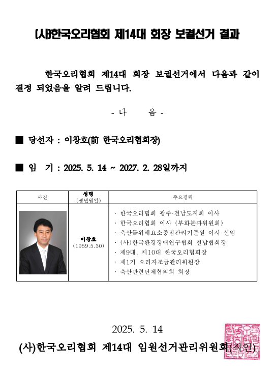 [한국오리협회] 제14대 이창호 회장 취임 알림