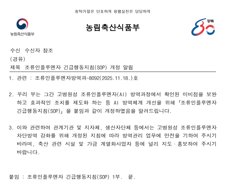 [농식품부] 조류인플루엔자 긴급행동지침(SOP) 개정 알림(2025.11.)