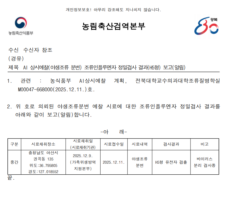 (충남 아산) 야생조류 조류인플루엔자(H5) 항원 검출에 따른 차단방역 및 예찰 강화 알림(충남 아산 권곡동, 분변)