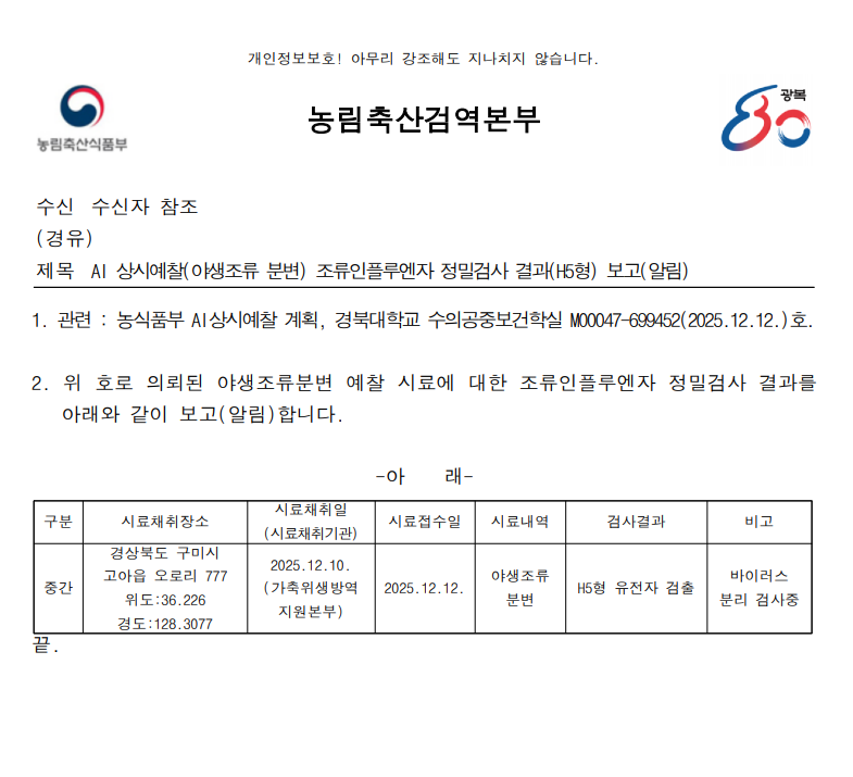 (경북 구미) 야생조류 조류인플루엔자(H5) 항원 검출에 따른 차단방역 및 예찰 강화 알림(경북 구미 감천, 분변)