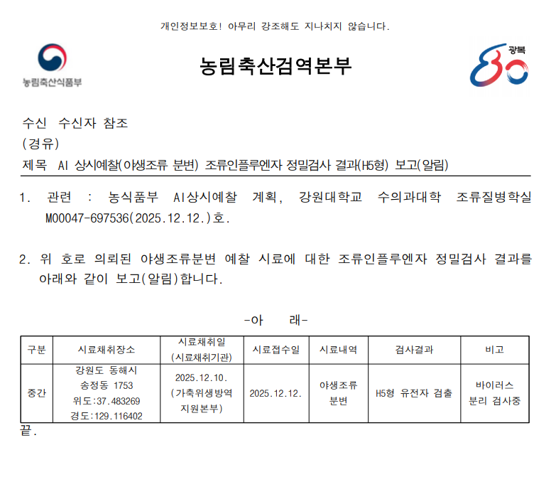 (강원 동해) 야생조류 조류인플루엔자(H5) 항원 검출에 따른 차단방역 및 예찰 강화 알림(강원 동해 전천, 분변)