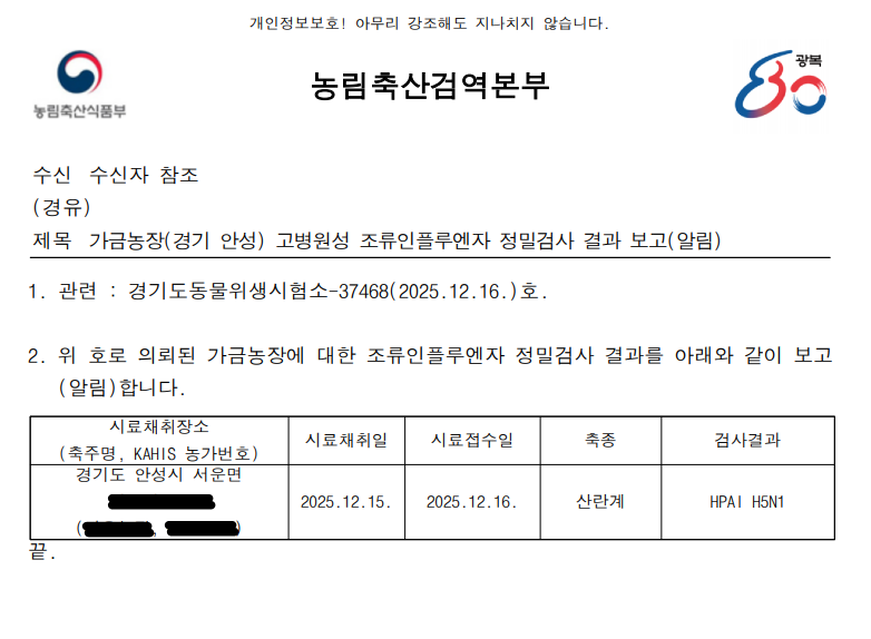 (경기 안성) 가금농장(산란계) 고병원성 조류인플루엔자(AI) 확진에 따른 방역조치 알림