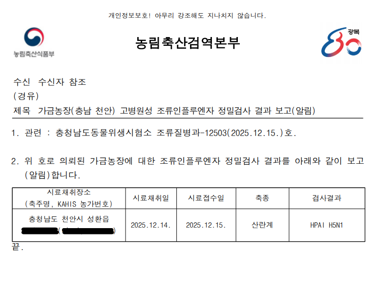 ▼ (충남 천안) 예방적 살처분 가금농장(산란계) 고병원성 조류인플루엔자(AI) 확진에 따른 방역조치 알림
