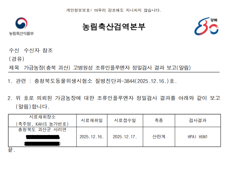 (충북 괴산) 가금농장(산란계) 고병원성 조류인플루엔자(AI) 확진에 따른 방역조치 알림