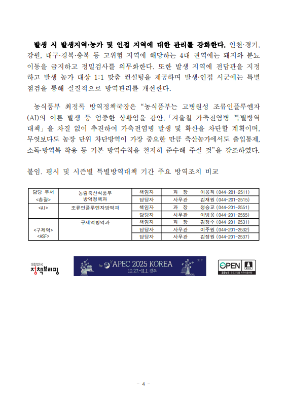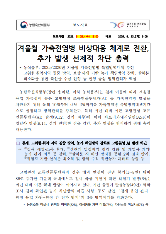 [농식품부 09.24] 겨울철 가축전염병 비상대응 체계로 전환, 추가 발생 선제적 차단 총력
