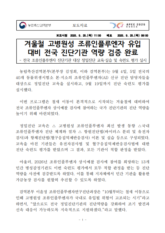 [검역본부 09.25] 겨울철 고병원성 조류인플루엔자 유입 대비 전국 진단기관 역량 검증 완료