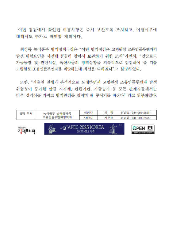 [농식품부 10.15] 농식품부, 올 겨울 고병원성 조류인플루엔자 발생에 대비하여 선제적으로 위험지역 집중 점검 실시