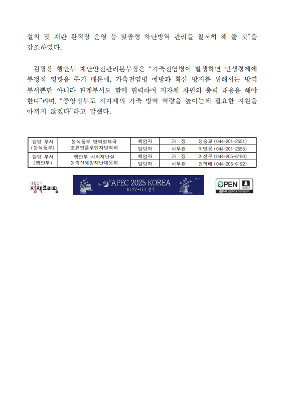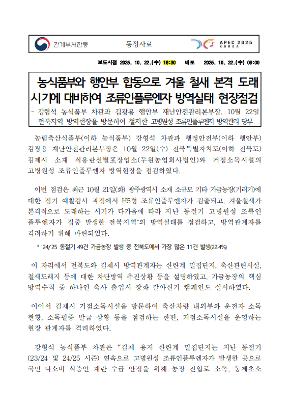 [농식품부 10.22] 농식품부와 행안부 합동으로 겨울 철새 본격 도래시기에 대비하여 조류인플루엔자 방역실태 현장점검