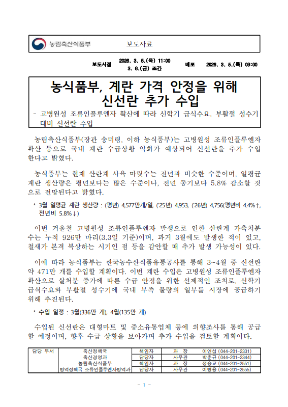 [농식품부 03.06] 농식품부, 계란 가격 안정을 위해 신선란 추가 수입