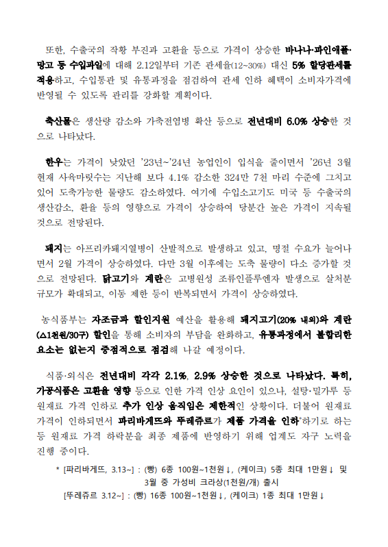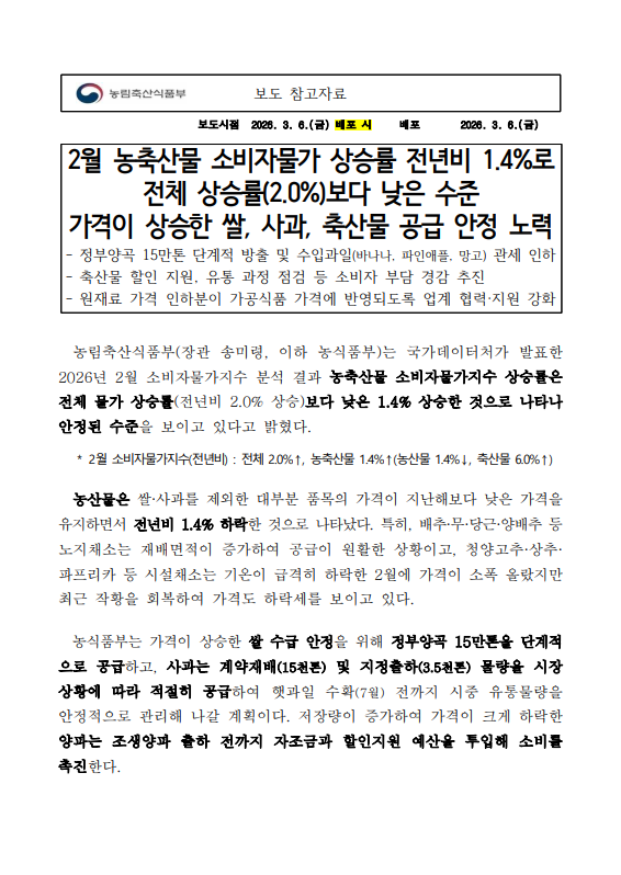 [농식품부 03.06] 2월 농축산물 소비자물가 상승률 전년비 1.4%로 전체 상승률(2.0%)보다 낮은 수준 가격이 상승한 쌀 사과 축산물 공급 안정 노력