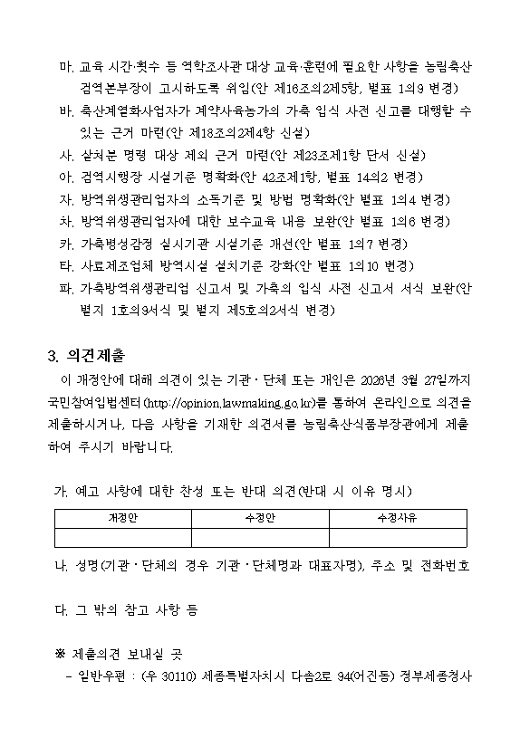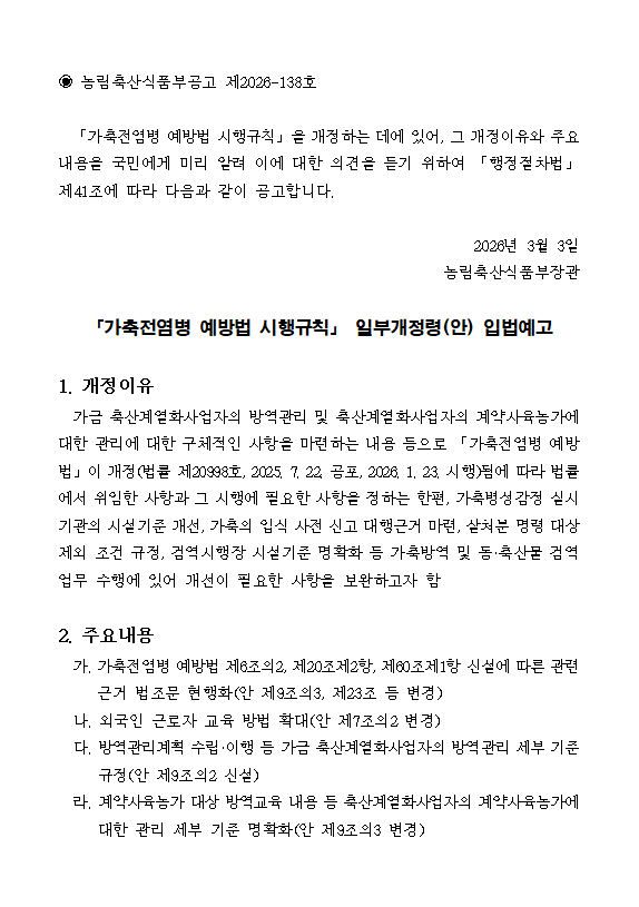 「가축전염병 예방법 시행규칙」일부개정령안 입법예고(~26.3.27. 의견조회)