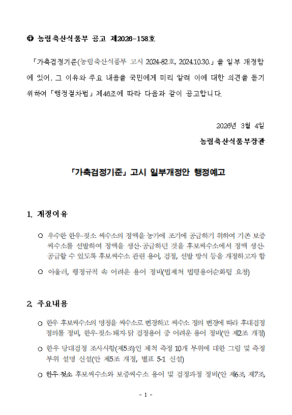 「가축검정기준」 고시 일부개정안 행정예고(~3.24. 의견조회)