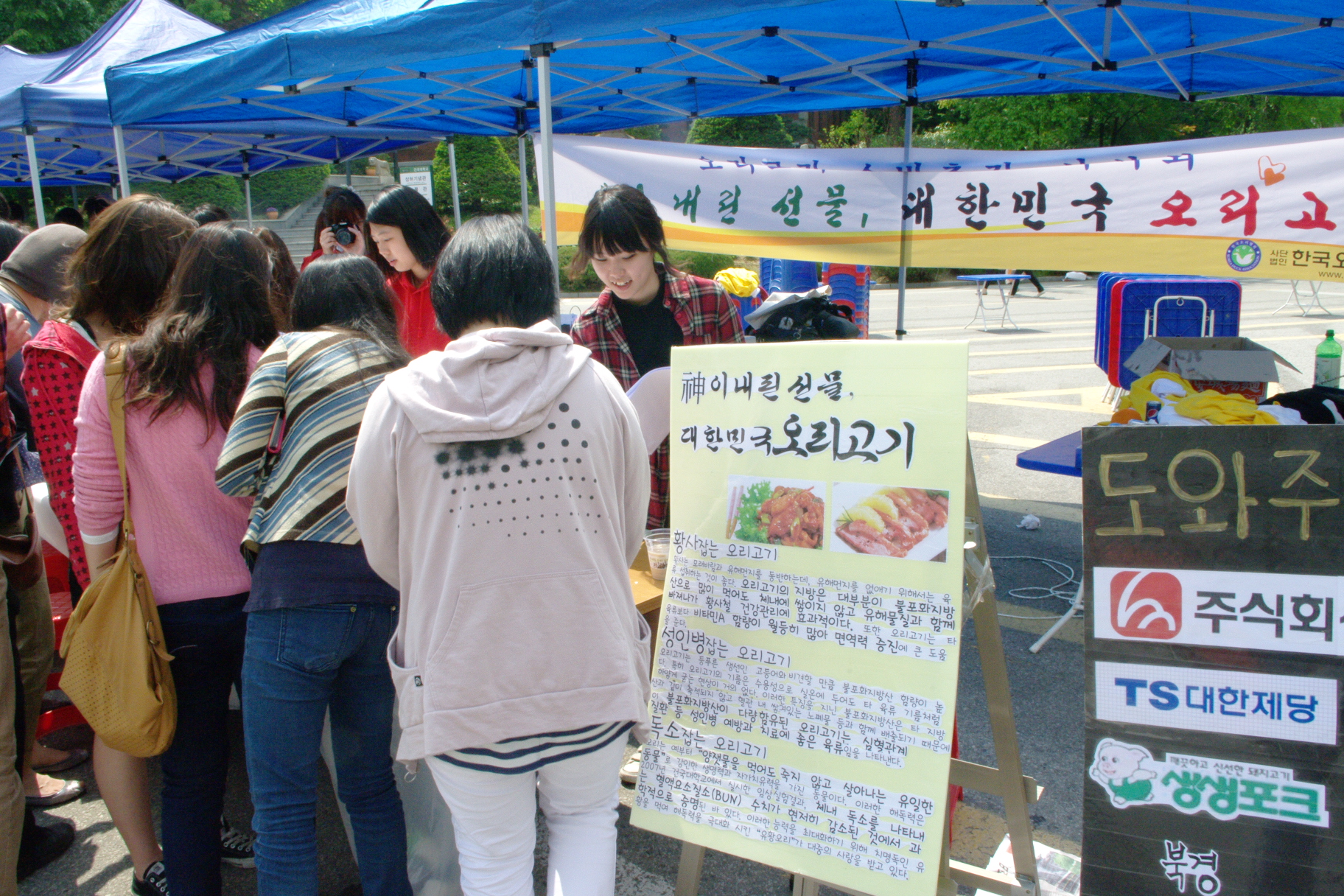 -건국대학교 행사시 소비촉진 시식회 및 설문 조사 실시해 ... - 1. 행 사 명: 건국대학교 오리고기 소비촉진 시식회 2. 행사일시: 2010. 5. 12(수). 12:00~15:00 3. 행사장소: 건국대학교 박물관 앞 삼각지 4. 주 최: (사)한국오리협회, 건국대학교 동물생산환경학과 □ 한국오리협회는 5월 12일(수) 건국대학교에서 오리고기 소비의 취약 계층인 대학생들을 대상으로 오리고기 소비촉진 시식회를 가졌다. □ 건국대학교 춘계 축제인 대동제를 맞이하여 동물생명과학대학 동물생산환경학과 학생들과 함께 진행한 이번 행사에서는 학생들에게 익숙한 오리고기 훈제 제품뿐만 아니라 오리 소시지, 오리 떡갈비 제품 등을 선보이며 좋은 반응을 얻었다. 이와 함께 오리고기 생산·유통 과정, 오리고기 효능에 관한 판넬을 설치하여 젊은층에 오리고기가 한발 더 친근하게 다가갈 수 있도록 하였다. □ 또한 학생들을 대상으로 음식점 원산지 표시제 및 필요성, 오리고기 선호도에 관한 설문조사도 실시하였으며, 이에 대한 결과는 곧 집계하여 발표할 예정이다.
