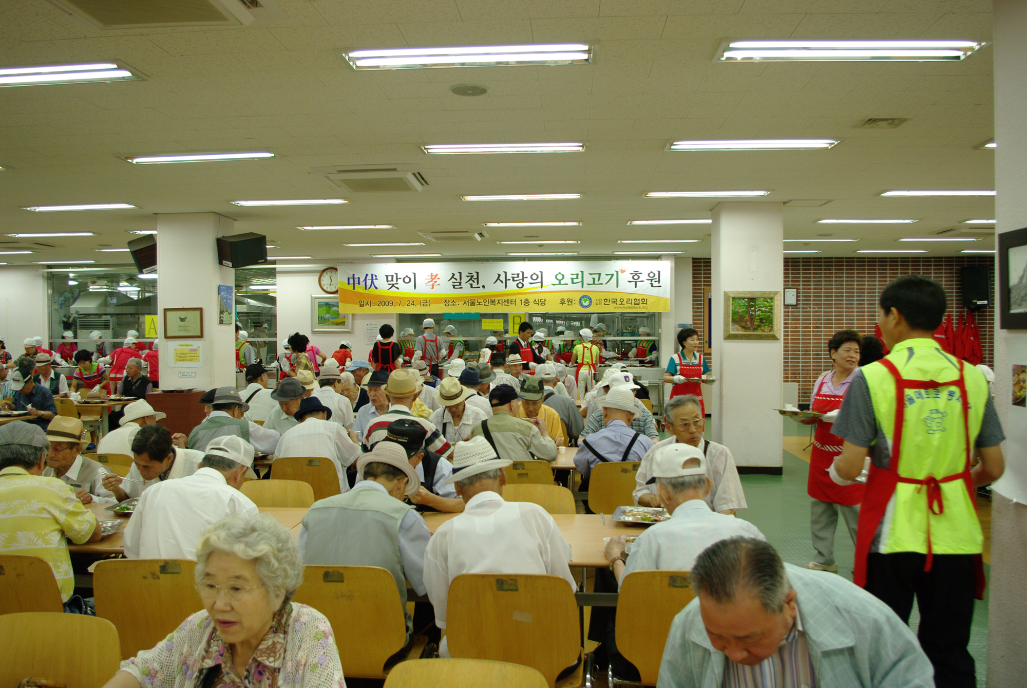 7월 24일 중복(中伏)을 맞이하여, 한국오리협회에서는 서울노인복 지센터에 2,500인분(약 900만원 상당) 훈제오리고기와 오리주물 럭을 후원하는 행사를 가졌다. 서울노인복지센터는 서울시가 설립 하고 대한불교조계종 사회복지재단이 위탁운영하는 노인전문 사회 복지기관으로, 여러 프로그램 진행과 함께 매일 2,500인분의 식사 를 노인분들께 제공하고 있다.