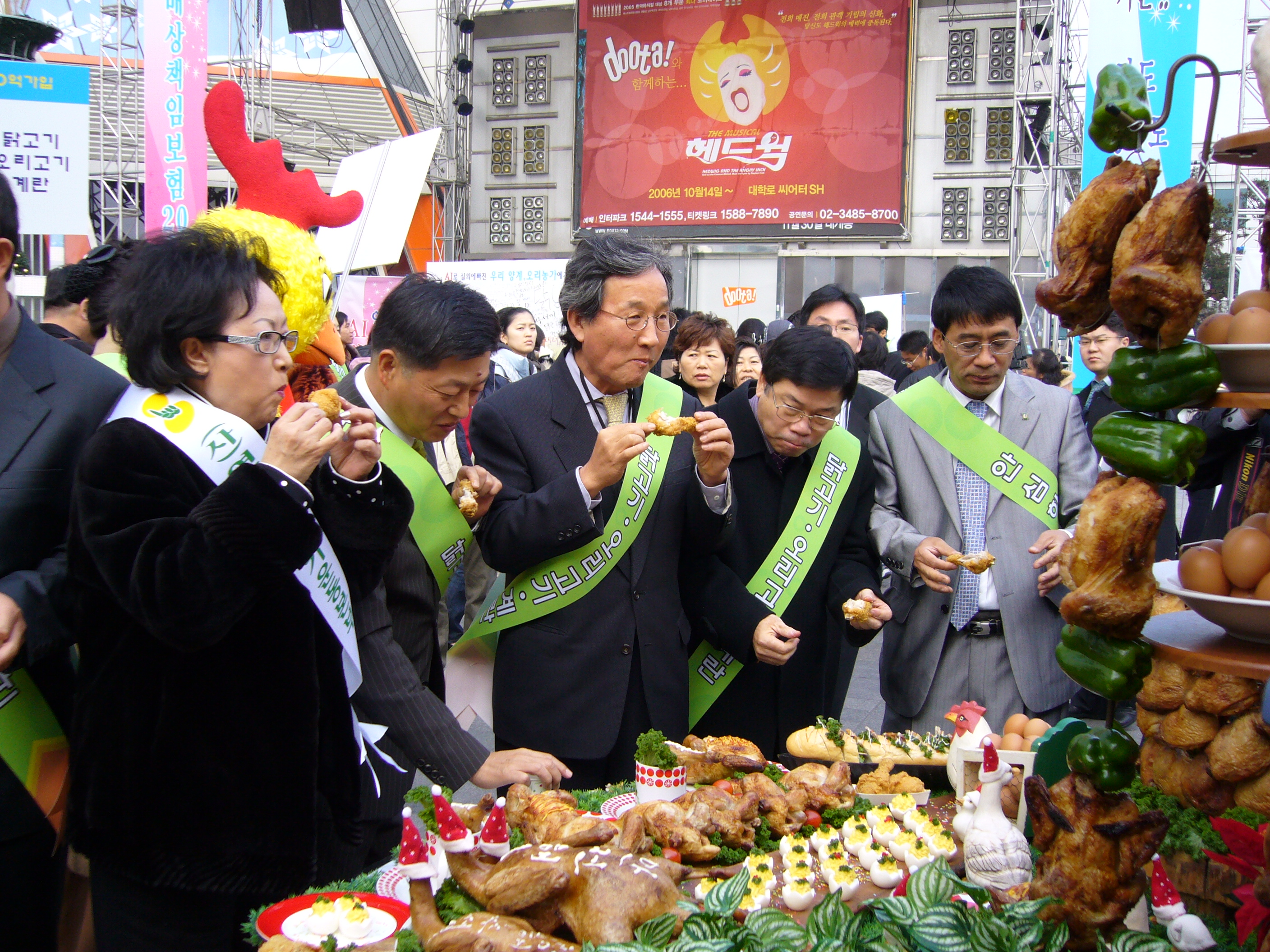 2006. 12. 12(화) 11:00 ~14:00 동대문 두타빌딩 앞 위) 농림부 축산경영과장(이상수) 등 오리고기 시식 아래) 오리협회 전무(김용진) 와 윤태농원(이창호)사장 시식