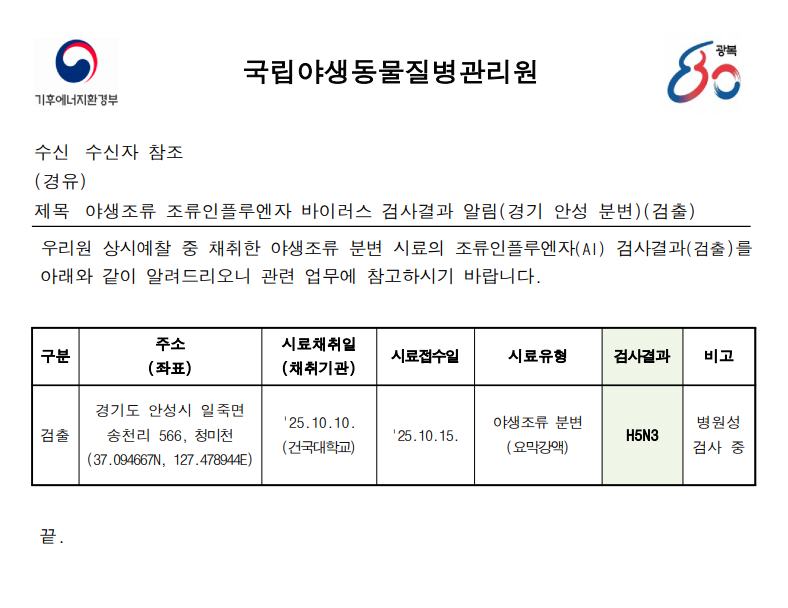 (경기 안성) 야생조류 조류인플루엔자(H5형) 항원 검출에 따른 차단방역 및 예찰 강화 알림(경기 안성 청미천, 분변)