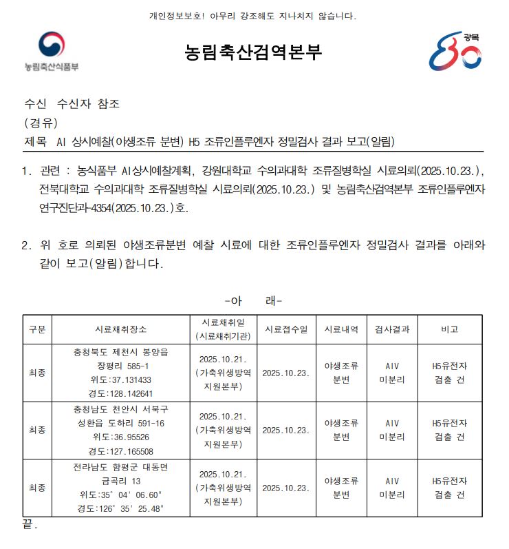(전남 함평) 야생조류 조류인플루엔자(H5형) 항원 검출에 따른 차단방역 및 예찰 강화 알림(전남 함평 금곡리, 분변)