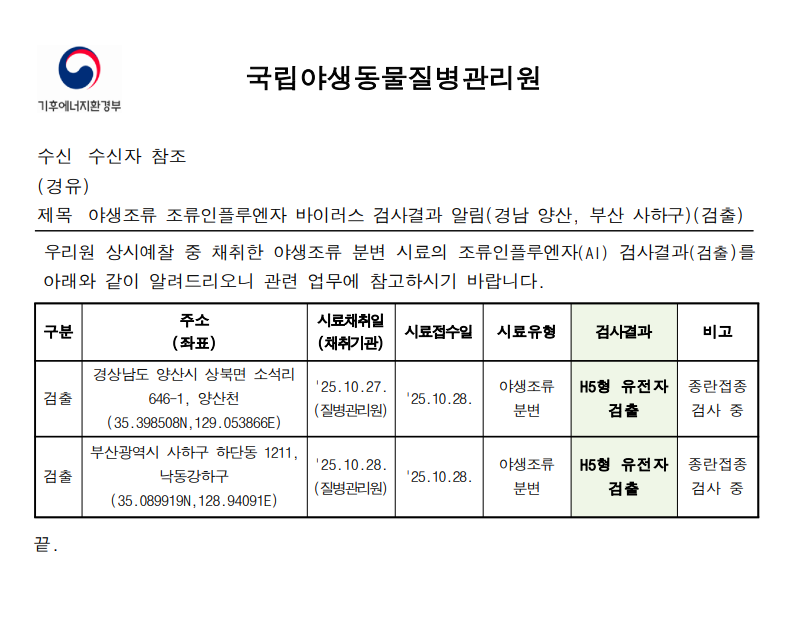 (경남 양산) 야생조류 조류인플루엔자(H5) 항원 검출에 따른 차단방역 및 예찰 강화 알림(경남 양산 양산천, 분변)
