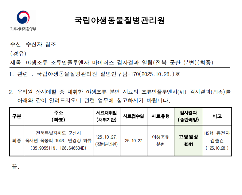 (전북 군산) 야생조류 고병원성 조류인플루엔자(H5N1형) 검출에 따른 차단방역 강화 알림(전북 군산 만경강, 분변)
