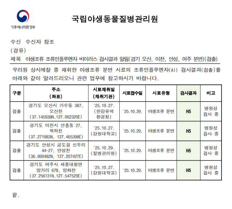 (경기 오산) 야생조류 조류인플루엔자(H5형) 항원 검출에 따른 차단방역 및 예찰 강화 알림(경기 오산 오산천, 분변)