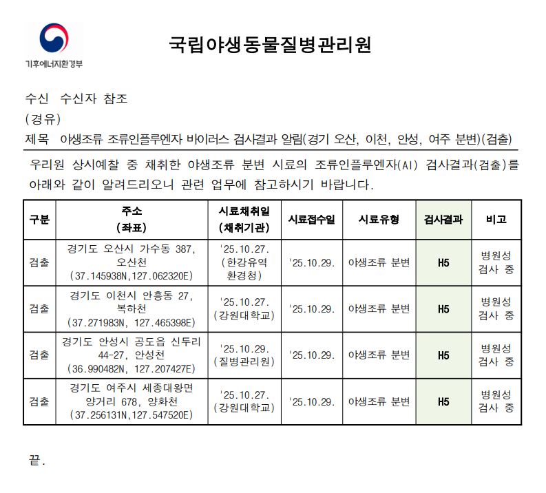 ▼ (경기 이천) 야생조류 조류인플루엔자(H5) 항원 검출에 따른 차단방역 및 예찰 강화 알림(경기 이천 복하천, 분변)