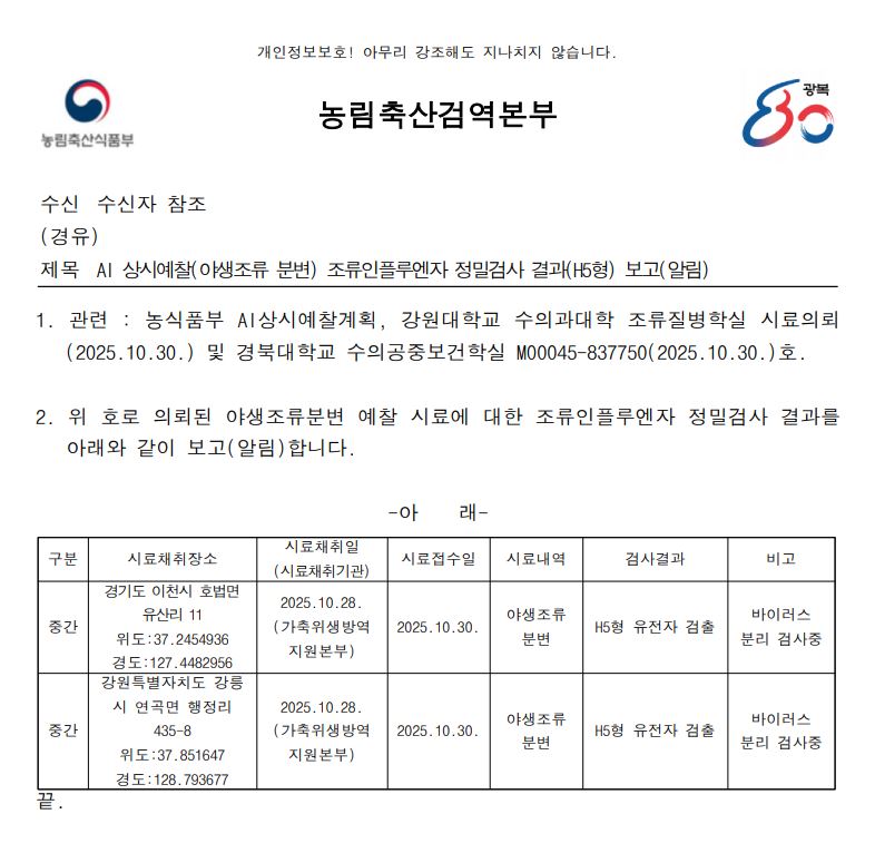 ▲ (강원 강릉) 야생조류 조류인플루엔자(H5) 항원 검출에 따른 차단방역 및 예찰 강화 알림(강원 강릉 연곡천, 분변)