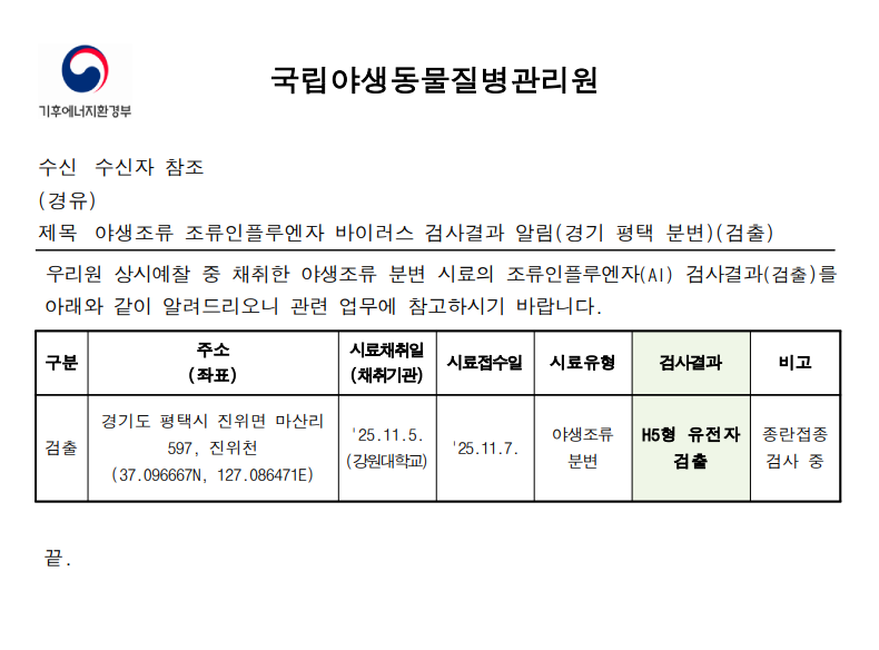 (경기 평택) 야생조류 조류인플루엔자(H5) 항원 검출에 따른 차단방역 및 예찰 강화 알림(경기 평택 진위천, 분변)