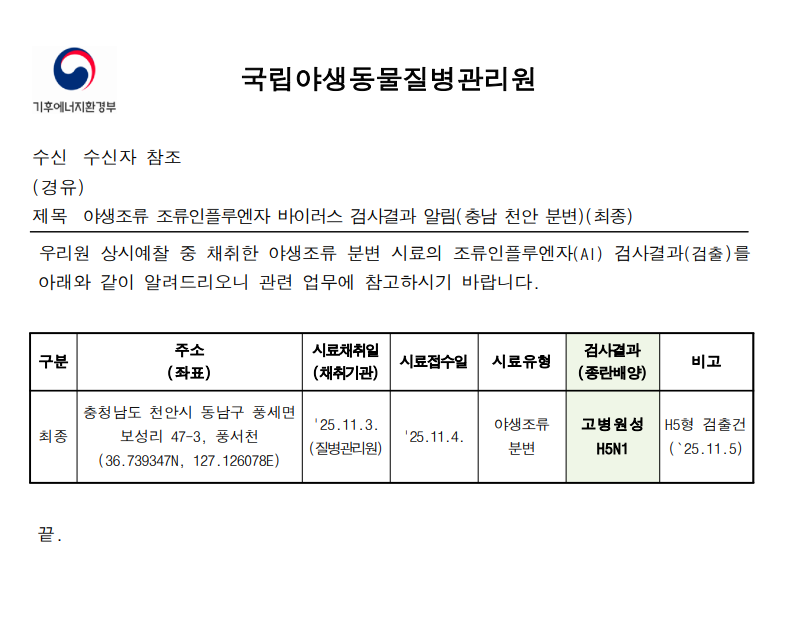 (충남 천안) 야생조류 고병원성 조류인플루엔자(H5형) 검출에 따른 차단방역 강화 알림(충남 천안 풍서천, 분변)