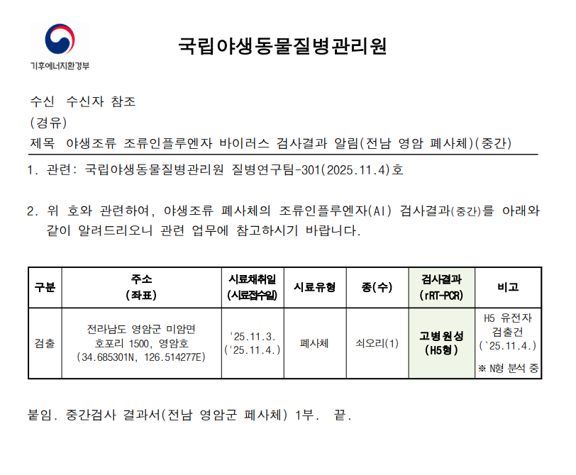 (전남 영암) 야생조류 고병원성 조류인플루엔자(H5형) 검출에 따른 차단방역 강화 알림(전남 영암 영암호, 폐사체)