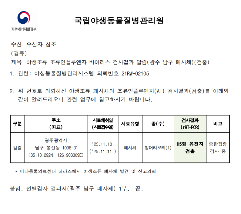 (광주 남구) 야생조류 조류인플루엔자(H5) 항원 검출에 따른 차단방역 및 예찰 강화 알림(광주 남구 봉선동, 폐사체)