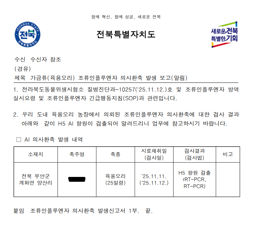 (전북 부안) 가금농장(육용오리) 고병원성 AI 의사환축 발생에 따른 방역강화 조치
