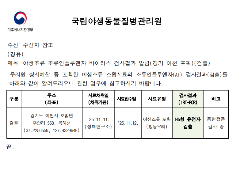 (경기 이천) 야생조류 조류인플루엔자(H5) 항원 검출에 따른 차단방역 및 예찰 강화 알림(경기 이천 복하천, 포획)
