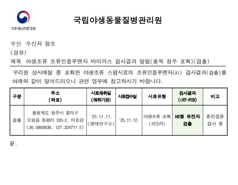 (충북 청주) 야생조류 조류인플루엔자(H5) 항원 검출에 따른 차단방역 및 예찰 강화 알림(충북 청주 미호강, 포획)