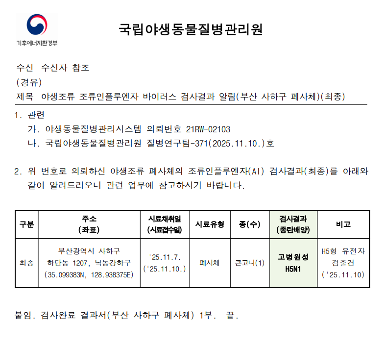 (부산 사하구) 야생조류 고병원성 조류인플루엔자(H5형) 검출에 따른 차단방역 강화 알림(부산 사하구, 폐사체)