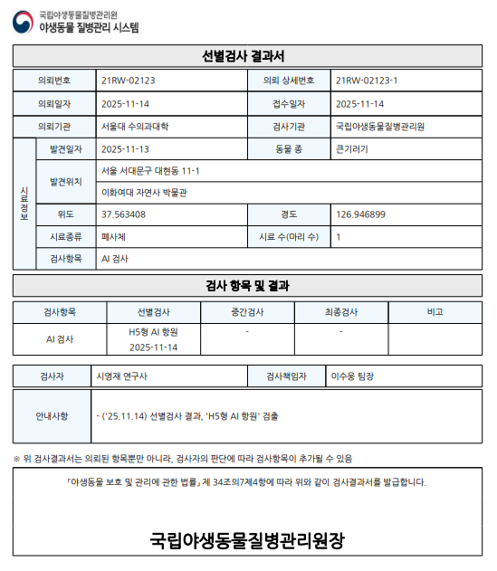 (서울 서대문구) 야생조류 조류인플루엔자(H5형) 항원 검출에 따른 차단방역 및 예찰 강화 알림(서울 서대문구, 폐사체)