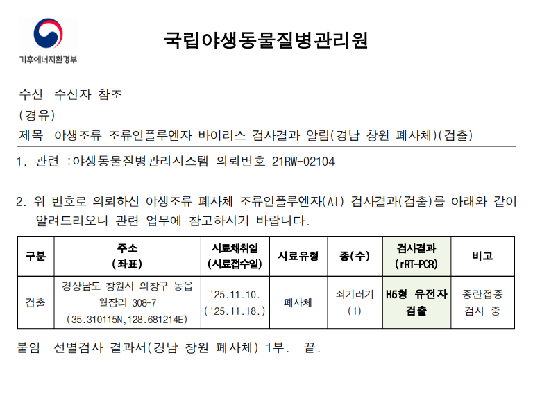 (경남 창원) 야생조류 조류인플루엔자(H5형) 항원 검출에 따른 차단방역 및 예찰 강화 알림(경남 창원 주남저수지, 폐사체)