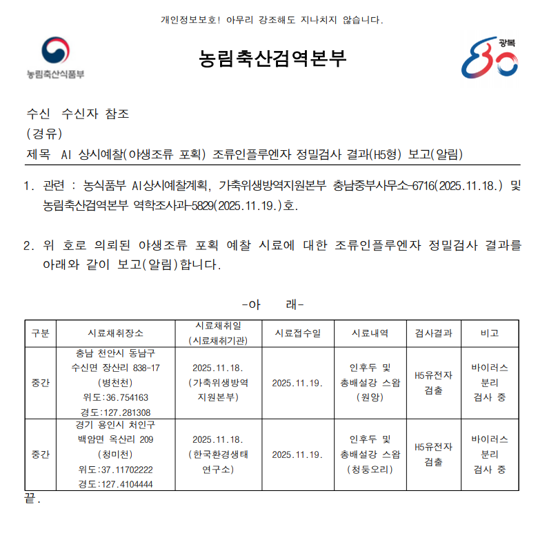 ▼ (충남 천안) 야생조류 조류인플루엔자(H5형) 항원 검출에 따른 차단방역 및 예찰 강화 알림(충남 천안 병천천, 포획)