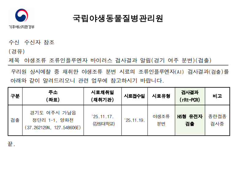 (경기 여주) 야생조류 조류인플루엔자(H5형) 항원 검출에 따른 차단방역 및 예찰 강화 알림(경기 여주 양화천, 분변)