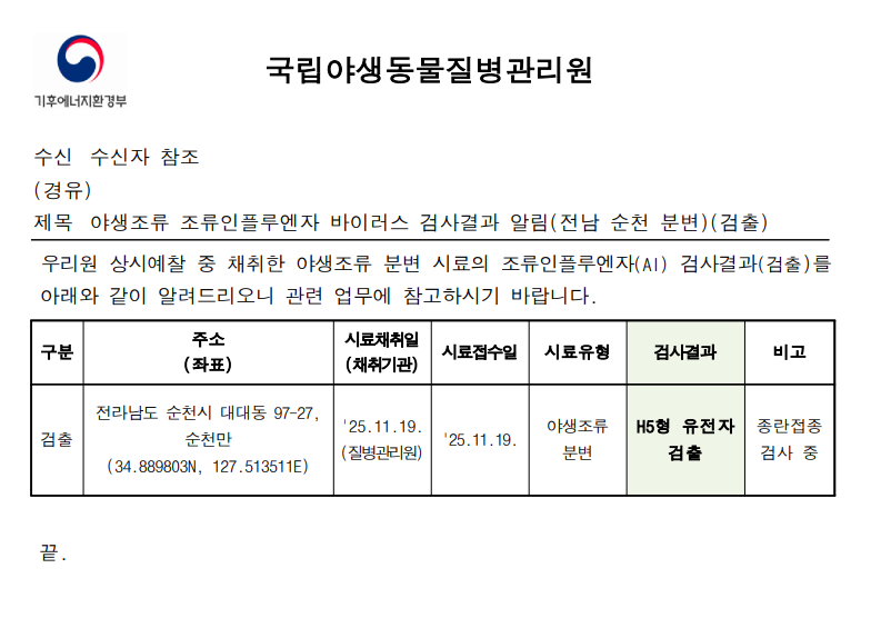 (전남 순천) 야생조류 조류인플루엔자(H5형) 항원 검출에 따른 차단방역 및 예찰 강화 알림(전남 순천 순천만, 분변)