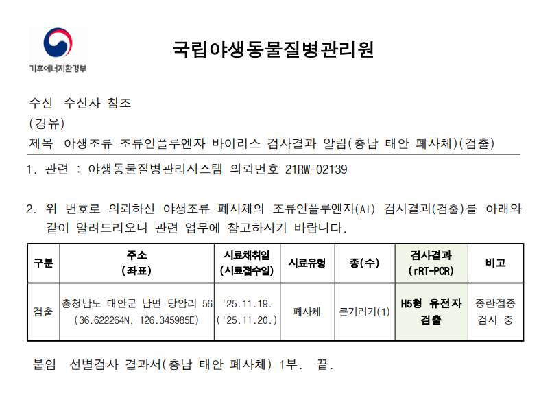 (충남 태안) 야생조류 조류인플루엔자(H5형) 항원 검출에 따른 차단방역 및 예찰 강화 알림(충남 태안 부남호, 폐사체)