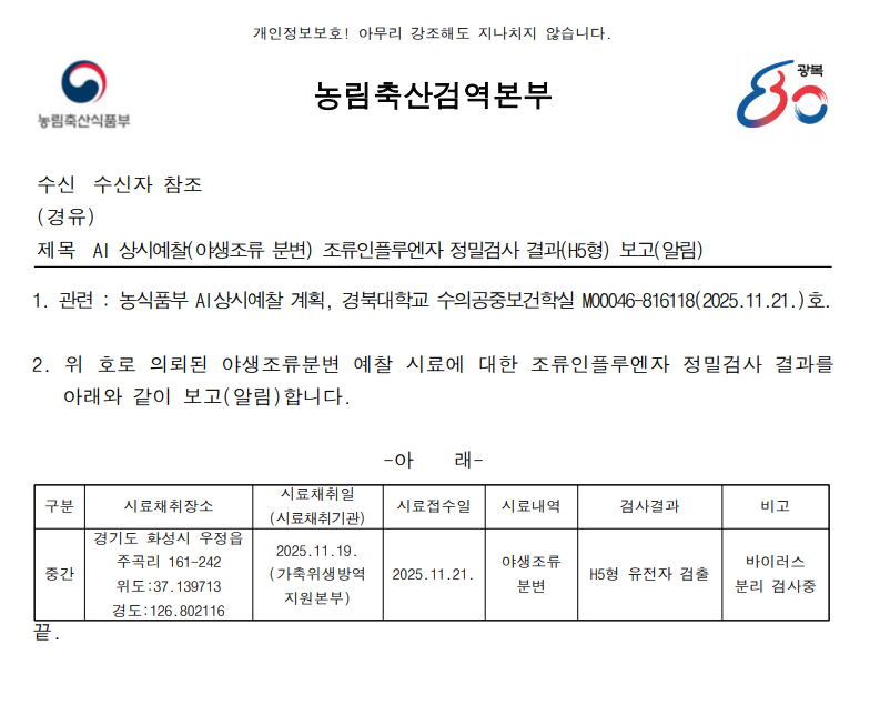 (경기 화성) 야생조류 조류인플루엔자(H5형) 항원 검출에 따른 차단방역 및 예찰 강화 알림(경기 화성 우정읍, 분변)