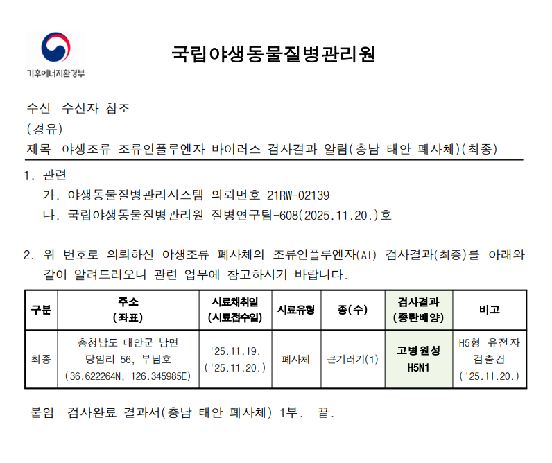(충남 태안) 야생조류 고병원성 조류인플루엔자(H5형) 검출에 따른 차단방역 강화 알림(충남 태안 부남호, 폐사체)