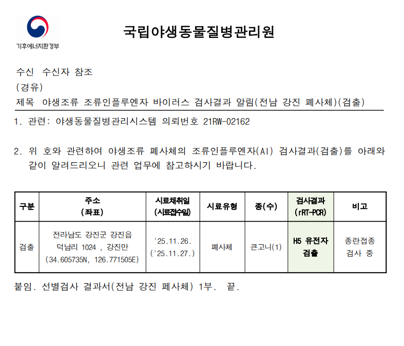 (전남 강진) 야생조류 조류인플루엔자(H5형) 항원 검출에 따른 차단방역 및 예찰 강화 알림(전남 강진 강진만, 폐사체)