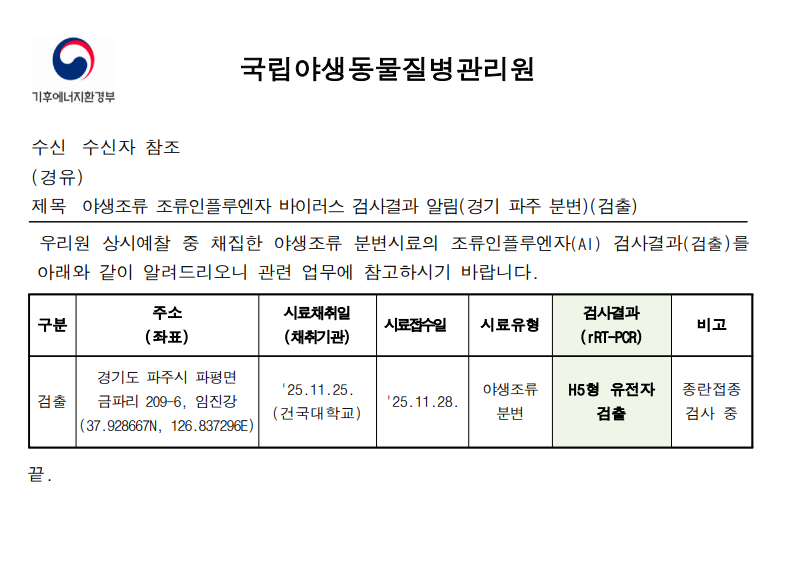 (경기 파주) 야생조류 조류인플루엔자(H5형) 항원 검출에 따른 차단방역 및 예찰 강화 알림(경기 파주 임진강, 분변)