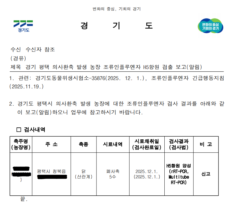 ▲ (경기 화성) 예방적 살처분 가금농장(산란계) 고병원성 조류인플루엔자(AI) 확진에 따른 방역조치 알림