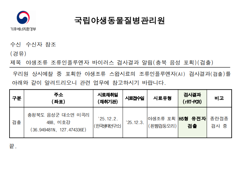 (충북 음성) 야생조류 조류인플루엔자(H5) 항원 검출에 따른 차단방역 및 예찰 강화 알림(충북 음성 미호강, 포획)