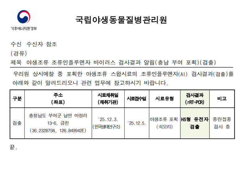 (충남 부여) 야생조류 조류인플루엔자(H5) 항원 검출에 따른 차단방역 및 예찰 강화 알림(충남 부여 금천, 포획)