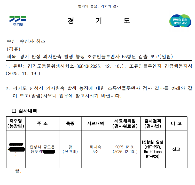 (경기 안성) 가금농장(산란계) 고병원성 AI 의사환축 발생에 따른 방역강화 조치