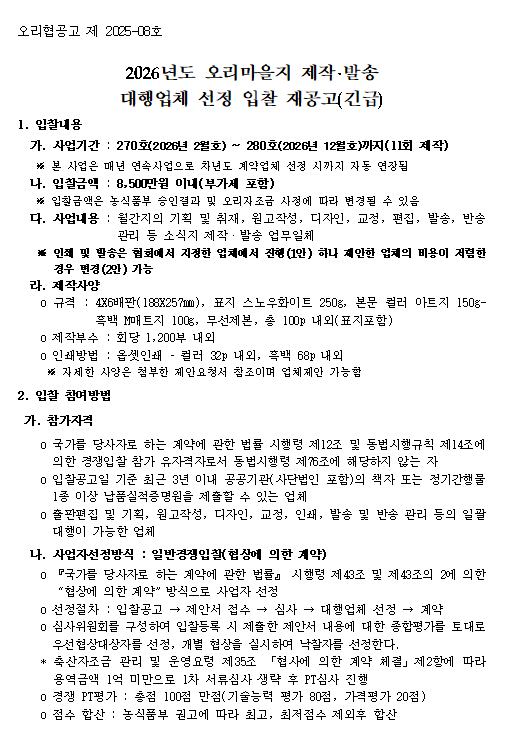 첨부파일 : 2026년도 오리마을지 제작·발송 대행업체 선정 입찰 재공고(오리협공고 제 2025-08호).hwp